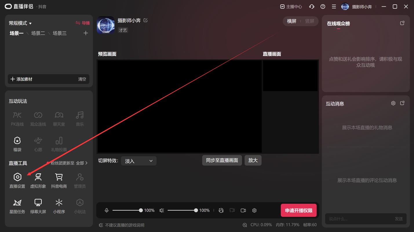 - 打开直播伴侣后,你会看到一个主界面,分为几个区域:摄像头预览、素材库、场景、特效等。