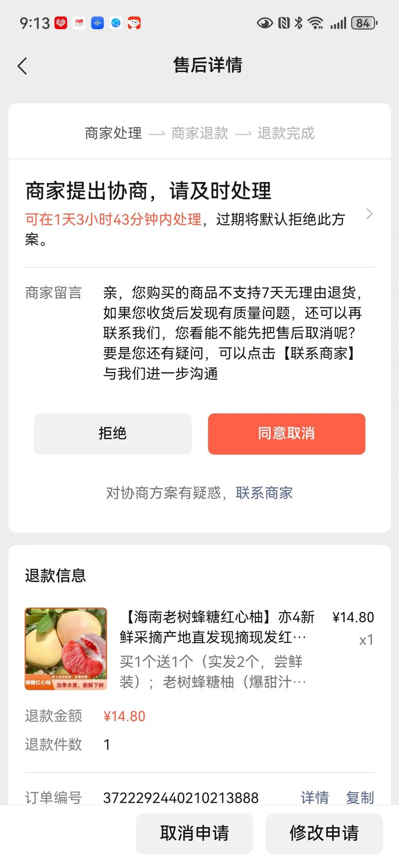 这是最常见的情况,通常发生在你“仅退款”或者“退货退款”但商家不同意时。