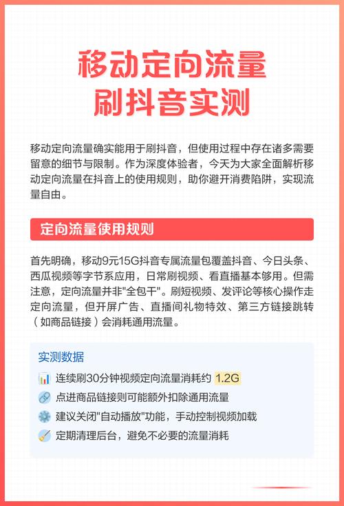 | 抖音定向流量看直播,流量免费吗? | 是的,通常免费。 观看抖音直播是抖音定向流量包的核心功能之一,只要你的套餐有效,这部分流量就不会消耗你的通用流量。 |