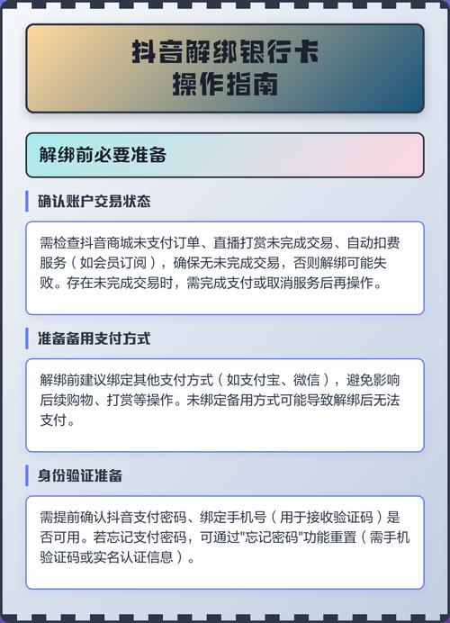 - 首选方法:在 抖音App → 我 → 钱包 → 银行卡 中解绑是最方便快捷的。
