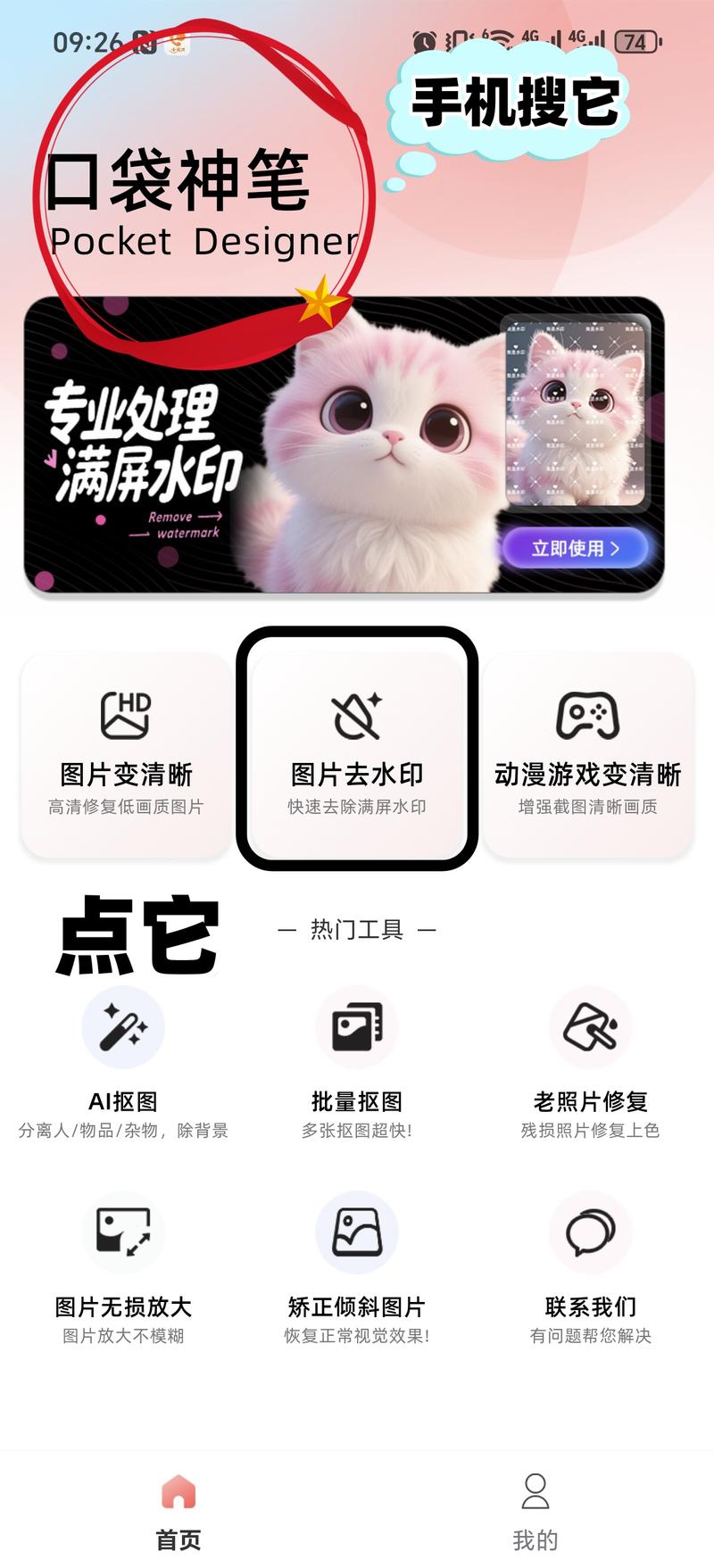 - 美图秀秀:打开App,选择“图片美化”,导入图片,找到“消除笔”或“修复”功能,用手指涂抹水印区域,软件会自动用周围像素填充。