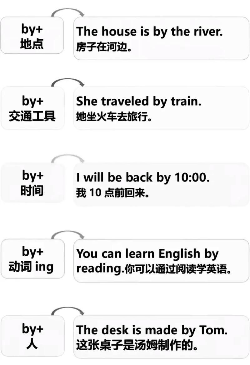 - 方式或手段:通过某种方式。"I go to work by bus." (我坐公交车去上班。)
