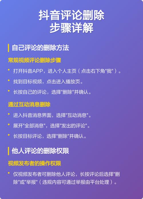 | 删除别人视频下的评论 | 找到视频 -> 找到自己的评论 -> 长按 -> 选择“删除” -> 确认 | 只能删除自己发布的。 |