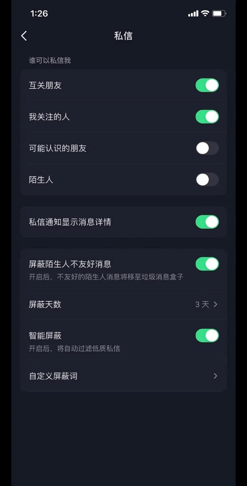 - 谁可以给我发私信:你可以选择“所有人”、“互关的人”或“关闭”,如果不是“关闭”,请确保你想要接收消息的人在你的允许范围内(设置为“互关”但对方没有关注你)。