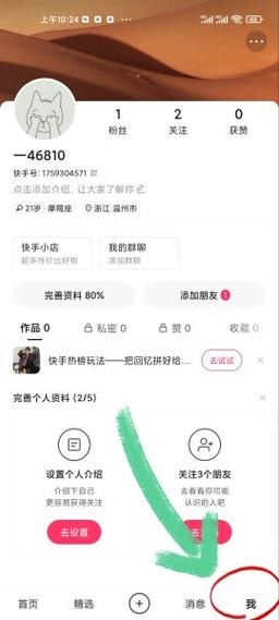 第一步:进入个人主页 打开快手APP,点击右下角的 【我】,进入你的个人主页。