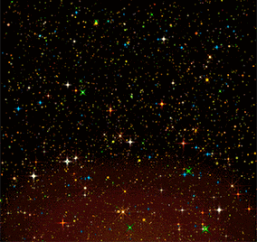 - 在这个纯色层上使用“蒙版”功能,画一个圆圈,并让这个圆圈从你的手中向外扩散,这样,星星就会只在蒙圈出现的地方显示,产生星星从手中迸发出来的感觉,你可以再叠加多层不同大小、速度的蒙版,让效果更丰富。