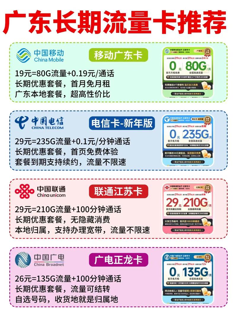 - 价格通常很便宜,月租低,流量多(但多为通用流量)。
