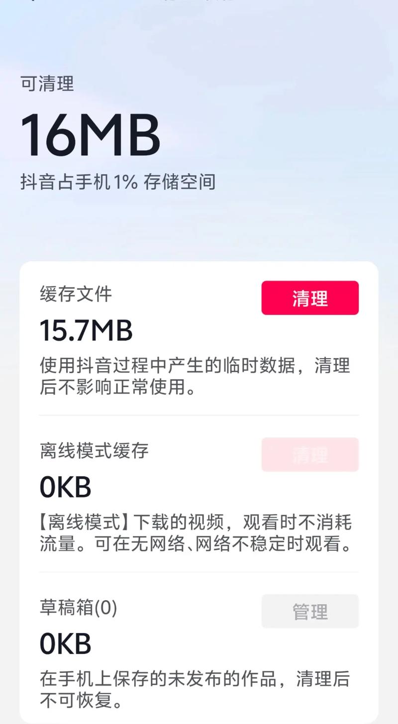 - 清除抖音缓存: 进入手机的 【设置】 -> 【应用】 -> 找到 【抖音】 -> 点击 【存储】 -> 点击 【清除缓存】。(注意:清除缓存不会删除你的草稿和作品,只是清理临时文件)。