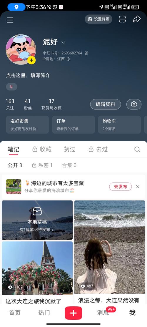 - 点击【个人简介】可以编辑你的个性签名,并添加 小红书号 和 联系方式(如微信、微博等)。